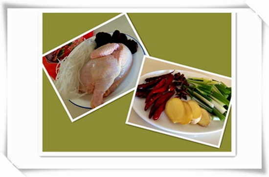 材料:母鸡(Costco 买的“Young Chicken”):2磅,蘑菇五朵,火锅宽粉丝三把,葱段,姜片,干红辣椒