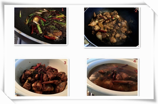 2. 锅内放油,红糖气泡后放酱油(炒糖色),八角,葱,姜,红辣椒,最后 放鸡块翻炒上色,水干