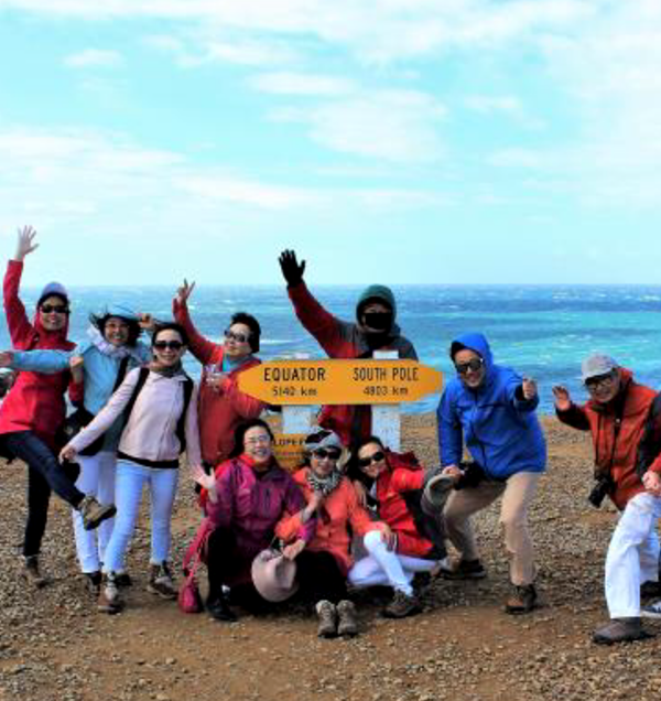 遥望南大洋,在往前4833公里,我们就到南极了,朋友们在路标下兴奋着。