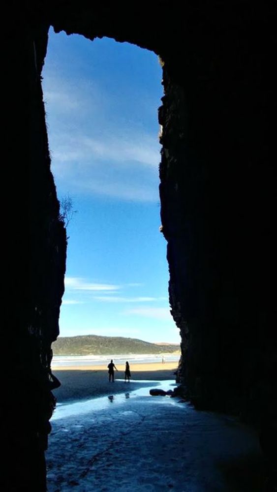 由洞口内向外的拍摄,天空,山野,大海和沙滩构成了一幅水彩画,画框便是岩洞壁。