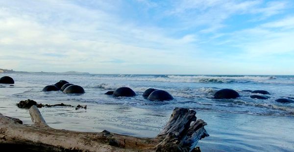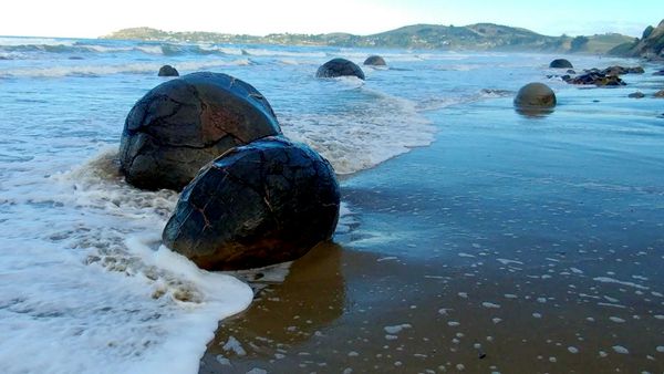 这些石头是400万年前,经过风化和海浪的打磨,神奇地以圆球状展示出来,不知为什么,有些大圆石里面竟是空洞的,被海浪和大风推到了沙滩上。