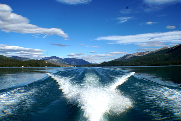 站在船上,抬头,瓦蓝的天空点缀着大朵大朵白云;低头,脚下的湖面是凉爽晶莹的蓝;两岸连绵着顶着积雪的山川和铺满碧绿云杉的山谷。。。