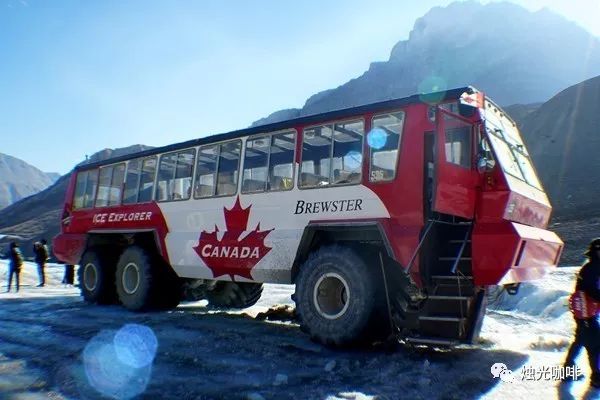 我们在网上订了票,按时到了游客中心,乘坐专门设计,用于行驶在冰上,大轮子的红色大巴,来到冰川顶端,用心和肌肤去触摸冰原。