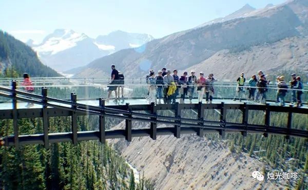 这是一座半圆形的玻璃栈道,站在上面可以极目远眺哥伦比亚冰川群和蜿蜒前行的峡谷溪流。