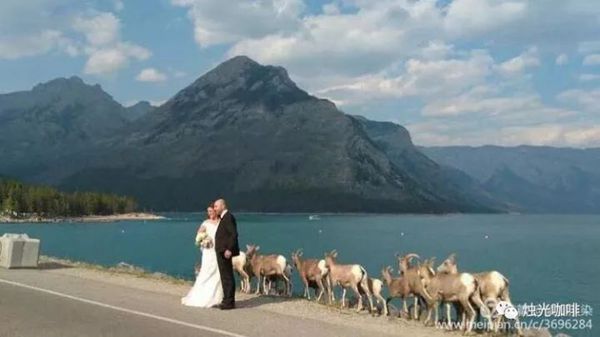 湖边的公路上遇到了一对新人在拍婚纱照,公路旁走过来一群野羊自愿来做伴娘。羊是为了公路上的盐而来。摄影:队员Yigang