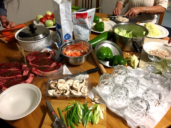晚餐就是“大餐了”,什么烤羊腿,煎牛扒,熏三文鱼的。晚餐前,通常是没开车的女生们下厨房忙着洗菜,切菜,全部配好,男生上灶掌勺。