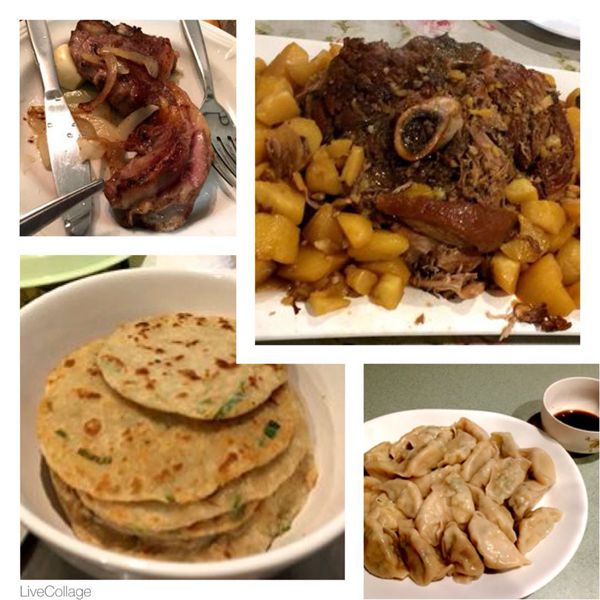 这一顿是焖肘子,鲜肉炒蒜薹,红烧肉,拌凉菜,糖拌西红柿,葱油饼。