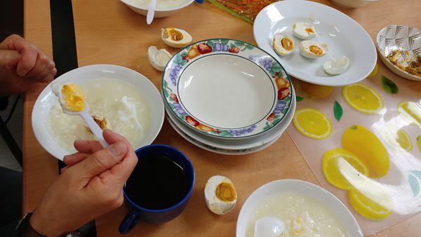 早餐:稀饭,鸡蛋(有时咸蛋)面包