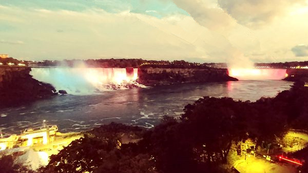尼加拉瓜大瀑布,加拿大侧的夜景,远处的彩灯打在瀑布上,每数分钟变幻着不同的颜色。