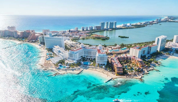 如果是一只海鸟,飞翔在加勒比海上空,便会看到墨西哥尤卡坦半岛东北端的“坎昆(Cancun)”,像一枚晶莹剔透的淡蓝宝石,优雅妩媚地镶嵌在乳白色的沙滩上,深邃动人,璀璨生辉。