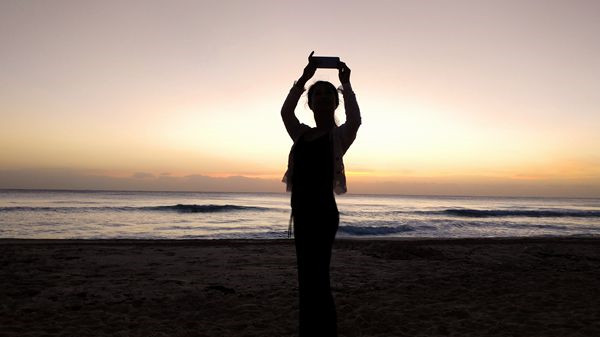 高举着手机迎接太阳