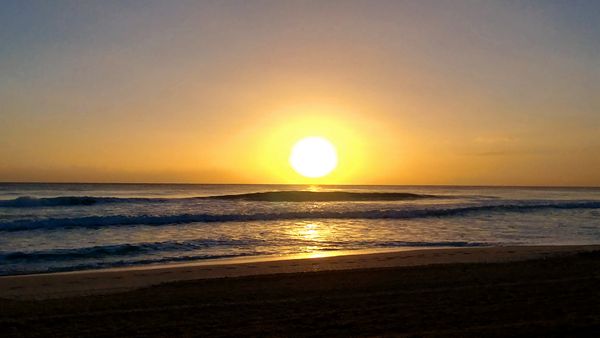 天际显出鱼肚白,突然在海平线上现出橘黄色三道霞光,我知道,那里会有太阳升起。遗憾的是,几块乌云的遮挡,我们并没有看到太阳跃出海面的精彩瞬间。