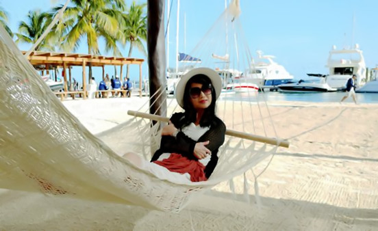 坐在吊床上,时而装深沉,时而搞怪,忘记了年龄,随心所欲地消磨时光。