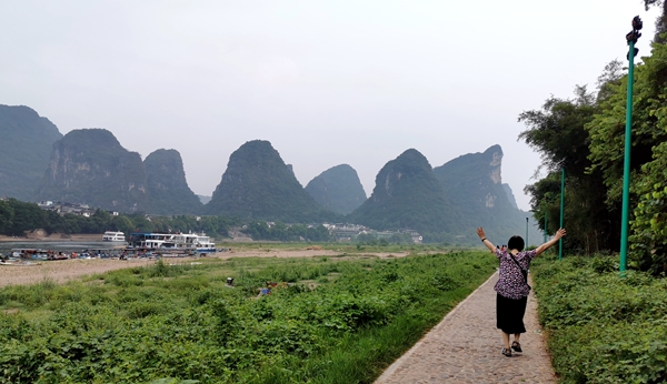 姐姐走在漓江边小道上像孩子一样开心,当然了,我最重要的任务是保证她“没事儿”。