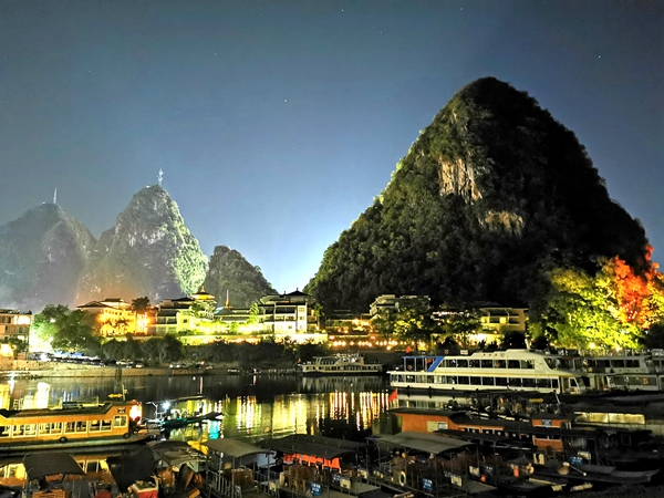 站在阳台上看到的夜景,对岸就是喧闹的阳朔西街。图左下角就是过江码头。