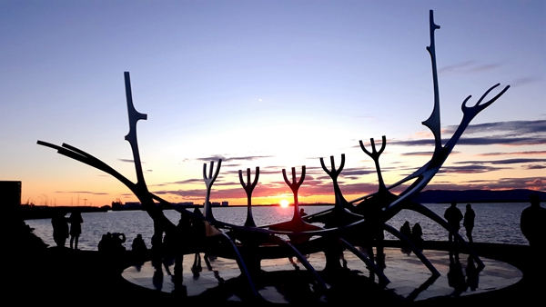 晚上11点多首都的太阳航海者雕像前的日落。因为是极昼,太阳刚刚沉落水中,马上有不甘心地跳了出来。