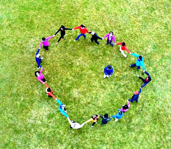 幼儿园的小朋友们在航拍仪下的“丢手绢”,拉圈圈儿。