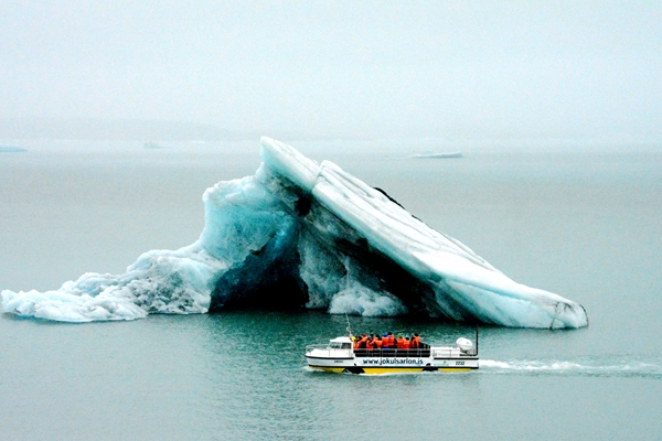我们的水陆两栖船驶入了冰湖,这是在岸上同学拍的,其中一个小脑袋是我。