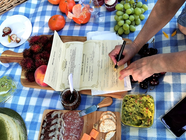 当摄影师离去后,我们开始了最重要的一幕:新郎儿子把政府部门发放的结婚证书拿了出来,小心翼翼地摊在野餐的垫子上,拿出笔让先生和我作为“证婚人”在空白栏上签字。