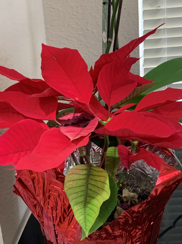 花四:一品红。中国红,是中国特有的颜色,充满时代气息,遍布中国人生活的角角落落。美国的这种红,好像只有感恩节,圣诞节期间看到,所以亦叫“圣诞红”。前几年,每逢黑色星期五,也没起早赶趟,自然醒来去Home Depot 买个八个、十个的一品红,一刀一个,估计是赔本买卖,只为回馈老客户。今年通胀压力大,花同样的钱,只拿到不到一半的花,觉得珍贵了,所以用心照料了,三个月后的今天,仍嫣然如初,不萎,不浊。