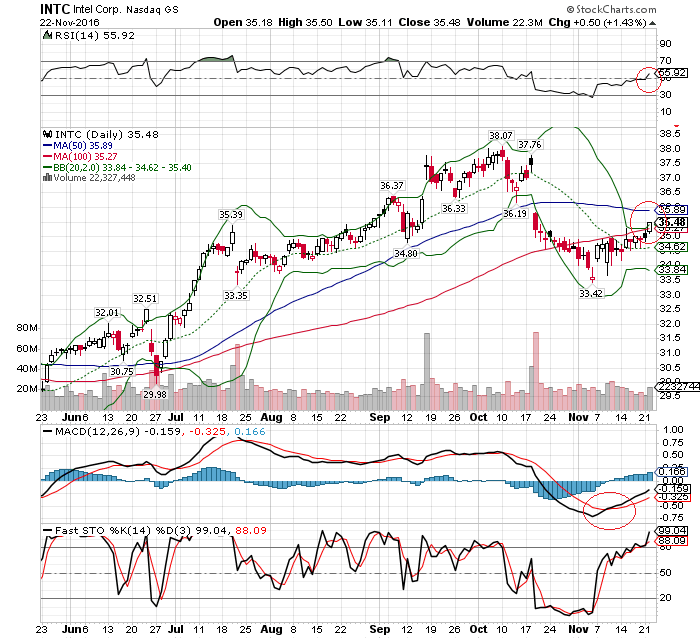 昨天semi板块及续领涨科技股,上涨的势头强劲。现在要跟随趋势,改变看熊思维。季报后受到打压的intc近期调整已到位,昨天克服阻力,重新站上100天均线。如果semi板块继续上涨,intc应该有机会。