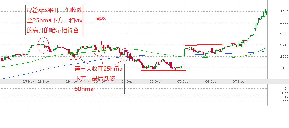 本周三spx收盘大涨1.3%。vix开盘时下跌,和spx走势匹配。但随着spx在下午不断地创新高,vix却逆向地止跌回升,到收盘涨3.5%。检查对照了过去三周spx和vix的15分钟的走势图,发现只要vix在25小时均线下方运行,那么spx就会继续沿其50小时均线上涨。反之,如果vix上涨至50小时均线上方,那么spx就要跌破其50小时均线,进入回调波。周三,尽管vix逆spx的走势上涨,但收盘仍然处于25小时均线的下方。因此昨天vix,spx二者走势不匹配,没有指标性意义。换句话说,根据目前vix的走势,还看不出来spx要任何发生实质性的大于0.5%的回调。但是,一旦vix继续上涨到25h均线上方,甚至50h均线上方,那牛就要提高警惕。