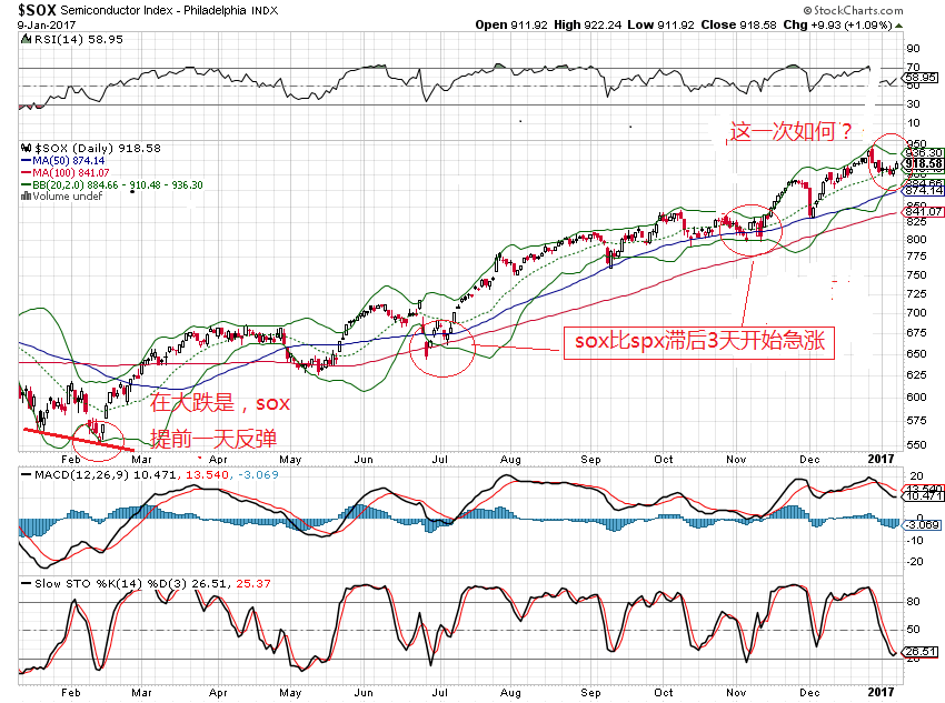 昨天有分析师发布mu,nvda的业绩最近有新的增长的报告,sox指数涨1.2%,重新站在20天均线以上。其中,前期受空头打压的牛股nvda涨4%,牛股amat也涨3%,mu涨1.5%。是否这暗示这几个牛股要带领sox去创新高?比较spx和sox中长期的走势图发现(见下图),在大多数由中期的底部反弹的情况,sox的上涨起步要比spx滞后几天。目前,spx似乎在做顶,sox能否先前几次那样继续向上反弹二,三天?试目以待。