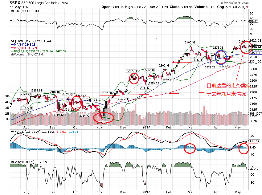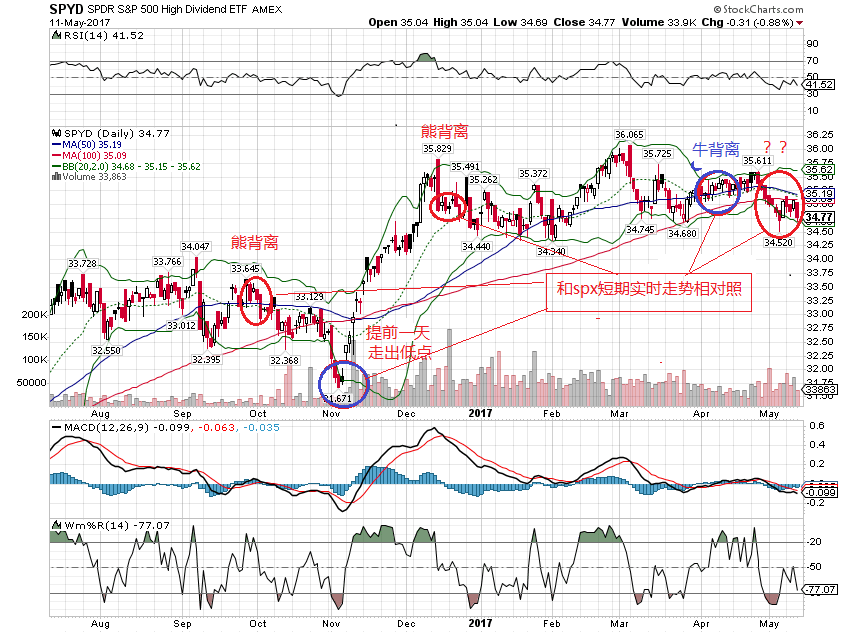spyd由spy中的75个发高股息的公司的股票组成(包括 ba,gm,dow,ko,mo,csco,ibm,mrk 等各行业内稳定经营的非成长性公司)。观察发现,spyd的走势具有领先指标的意义。当spx下跌接近底部时,spyd提起一天走出低点(见下图蓝圈)。在大盘处于极端下跌情况时,观注spyd的实时走势,能够提供提前一天买进指数etf的机会。在非极端情况,spyd的反向变盘总要比spx提前二,三天(见下图)发生。这一点的实践意义是,如果发现二者在短期内的走势出现背离情况,那么就要警惕大盘是否有可能出现反向变盘的可能性(加下图)。近两周以来,spx在接近高点区横盘,但spyd已经明显下跌,这暗示以后几天大盘有可能进入一个调整期。