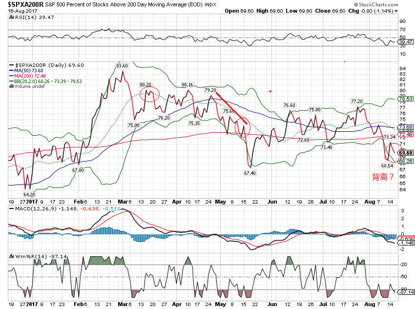 8月16日spx盘中冲高回落,多头冲击20天均线的努力再次失败。spx收盘涨0.15%,而spxa200r跌 1.1%(见下图),和spx走势明显背离,暗示spx后市看跌。rsp,sp500的equal weight etf 收盘涨0.25。 本次调整rsp跌至100ma,而spx仅仅跌到50ma,因此昨天rsp的的稍大的涨幅可以理解为超跌后的反弹。另外,大牛股aapl,nvda昨天逆势下跌,失去领涨股的角色,拖累科技股的反弹,前期深跌股goog,mu等领涨科技股。暗示科技股的反弹已经到了末期?总之,昨日大盘和科技股反弹乏力,后市谨慎看跌。 个人看法,仅供参考。