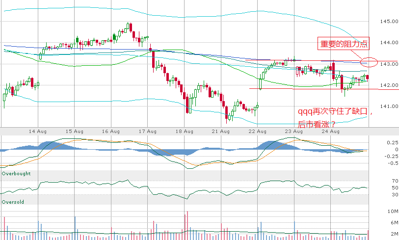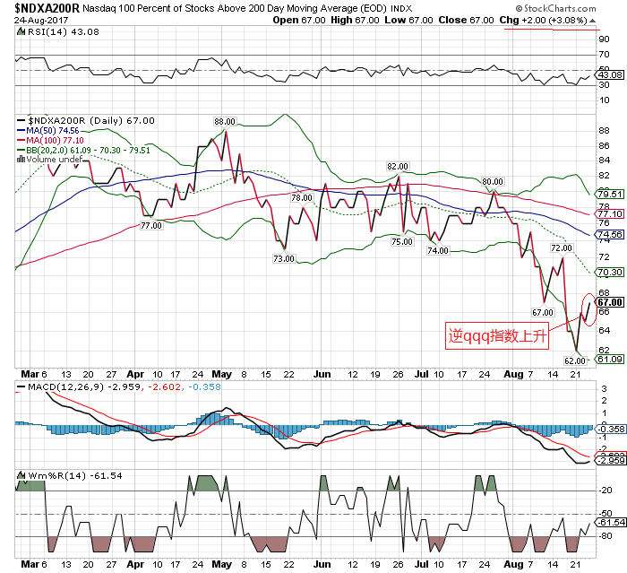 8月24日qqq盘中再次守住50天均线,收盘跌0.3%,多空双方打个平手(见图)。但有个迹象值得注意,广义指数ndxa200r逆势上升(见下图)。另外,分时图显示,周四盘中qqq守住了周三的跳空缺口,多头击退了空头的攻势。上述这两点是否暗示qqq已经走出了本次调整底部? 个人看法,仅供参考。