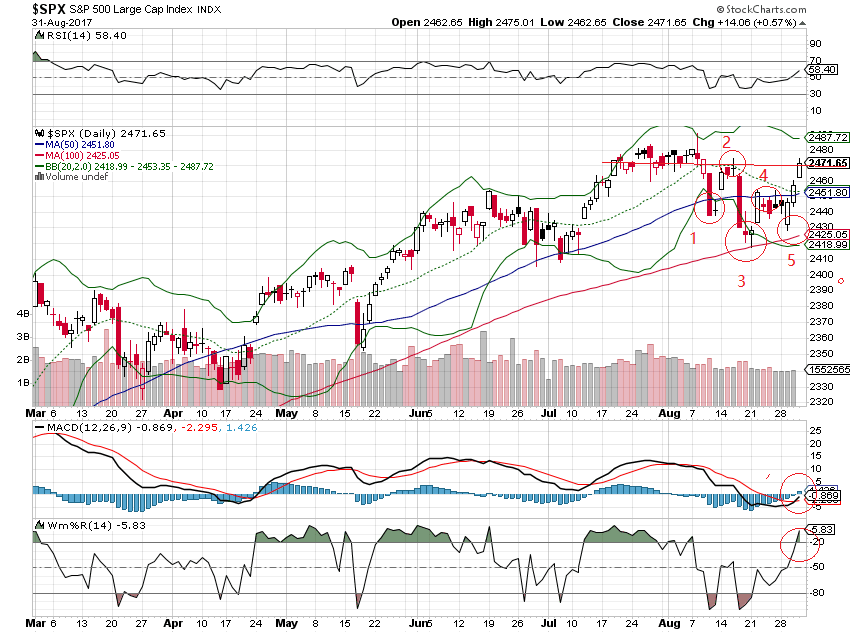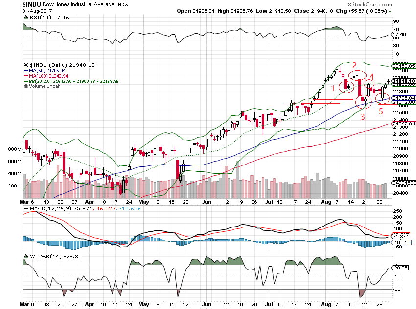 最近二天对大盘spx的走势有点摸不到头脑,TA好像失效。又看了dow的日线图,有点豁然开朗的感觉。在下面dow的日线图内已经标识出本次调整过程中MM是如何按规严格的TA规范控制指数的实际走势。在dow的图中,可明显的看出,20, 50, 100天均线扮演极重要的角色。1) 20ma起反弹作用,2)反弹不超过近期高点,3)跌破20ma后在50ma处反弹, 4)反弹受阻于20ma,5)dow再次在50ma反弹。上面1)~ 4) 完全在被我预测到了。唯独 5)出乎我预料之外。在spx的日线图内,对应的 1)~ 5)的意义就没有dow图中那么明显,看不出清晰的MM操盘的痕迹。如果自始至终的跟纵dow的日线图,或许可能早一点地省唔到MM的真实意图。这次失误的教训是,spx有500成分股,MM无法严格操控每个股票的走势,因此spx走势是市场内各种力量博弈的结果,并不完全体现MM的意志。而dow只有30个成分股,dow的走势完全体现MM的真实意志。因此,今后每天要首先观察dow的走势,感觉MM的真实意图。在理解dow的走势的基础上,去理解spx和qqq的走势。