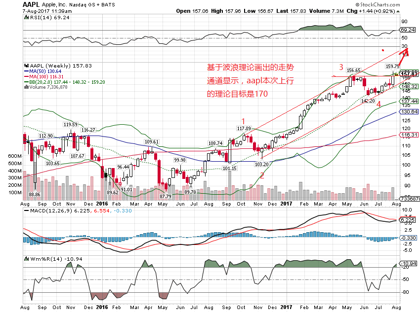 aapl已经有效的突破了前期高点156,按对称规则,理论上,本次 aapl 上涨的最高目标是170