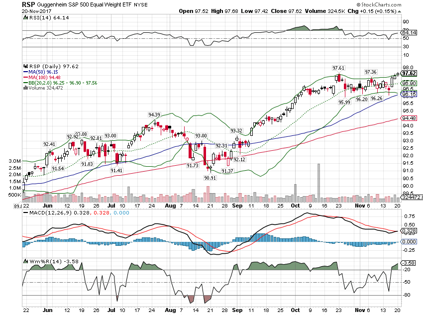 今天,多头开盘前扭转了期指深跌的被动。开盘后,多头步步为营推高指数。到收盘,dow,spx又重新站上20天均线,多头略占优势。spx breadth 指数bpspx继续反弹。特别是,sp500 equal weight etf rsp领先创出新高(见下图)。这显示spx 还有些许上涨的潜力。继续逢高出货。个人看法,仅供参考。