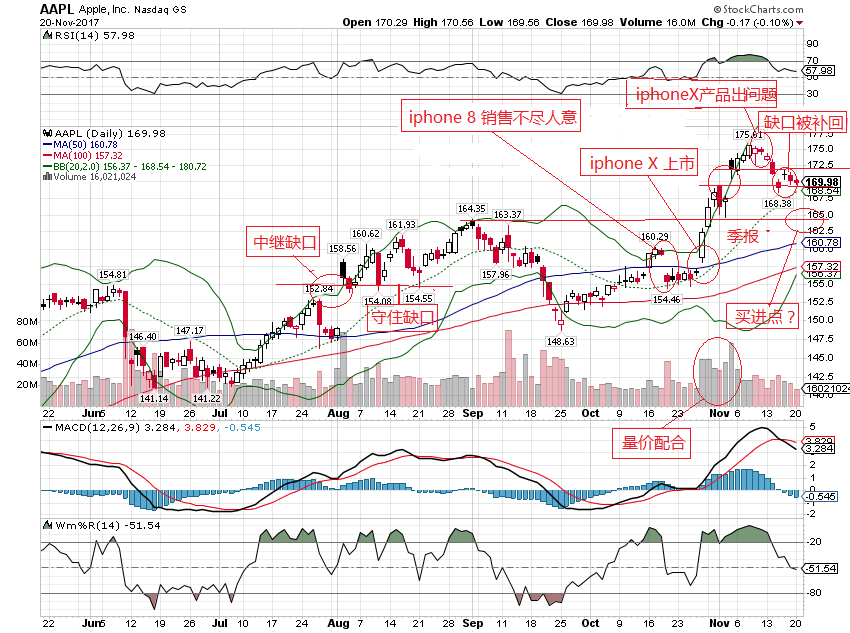 | 前期分析aapl走势时,看到aapl季报超预期后,股价跳空高开,留下缺口,据此判断这可能是个中继缺口,近而预测aapl近期上涨目标是185。此后涨到175时,曾径成功地回踩缺口上界反弹(详细见下图)。到此,aapl走势仍然符合原先的TA预期。不幸,此时传出iphone X出现技术问题的消息,并且坏消息接二连三,引发aapl跌破了缺口上界,直跌到缺口的下界后,才随大盘一起反弹、但仍然受阻于缺口上界(见下图)。目前aapl再次回落到缺口下界,看来,这次跌破缺口下界的可能性极高,并且有可能回踩下一个水平支持线165,甚至回踩50天均线160(见图)。如果多头能够守住165或者160,则这两点都是买进点。 现在回过头来看,这次中继缺口的预测能力失效,原因在于缺口形成之后,iphoneX 产品出现技术问题,这就改变了市场对aapl的预期,也就是说aapl的FA发生了变化。根老FA形成TA结论在新形势下当然也就不再有效了。换句话说,不是TA的规则失效,而是新的FA破坏了原来的TA结论。这再一次提醒我们,在采用TA的结论同时,要时时刻刻关注FA方面的任何新变化。 xx  |