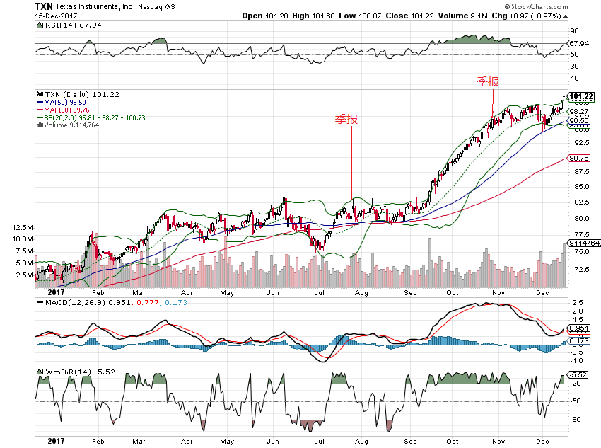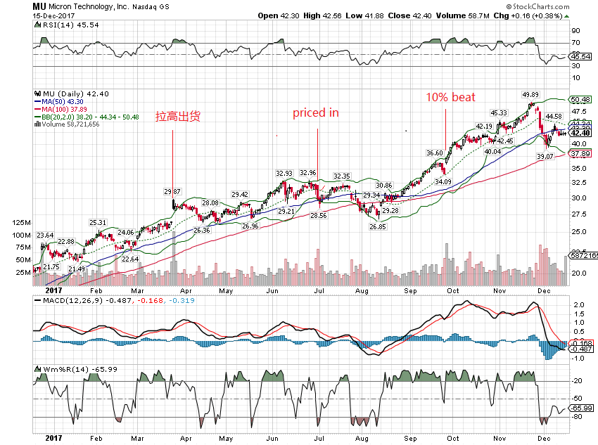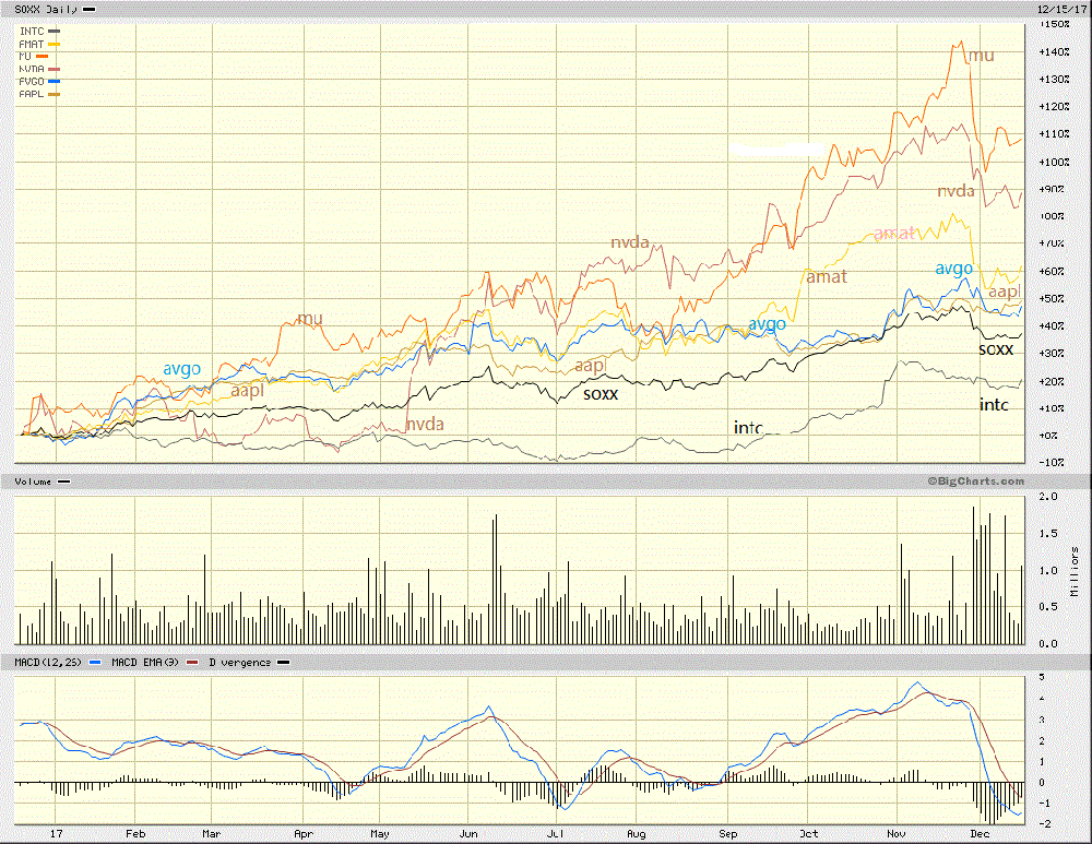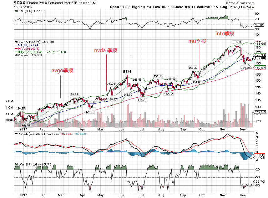 在soxx 的holding内,不同领域内的芯片巨头分别是,avgo(aapl芯片供应商), nvda(AI,深度学习),mu(内存和闪存),intc(大数据,cpu),txn(IoT)。到上周五,soxx 2017年上涨35%。对比上述个芯片巨头的走势图和soxx的走势图,可以清晰的看出,这几个大权重股在不同时期对soxx的上涨做出了各自的贡献。在2月-5月期间, avgo和nvda的强势上涨推动soxx上涨20%。此后avgo和nvda股价走平,soxx也进入长达3个月的盘整期。9月份,mu的季报超好,股价快速上涨,也推动soxx进入快速上升期。在10月下旬,mu的利好已经耗尽,但突发的intc的超好的季报推动soxx股价再上一层楼(见下面各图)。