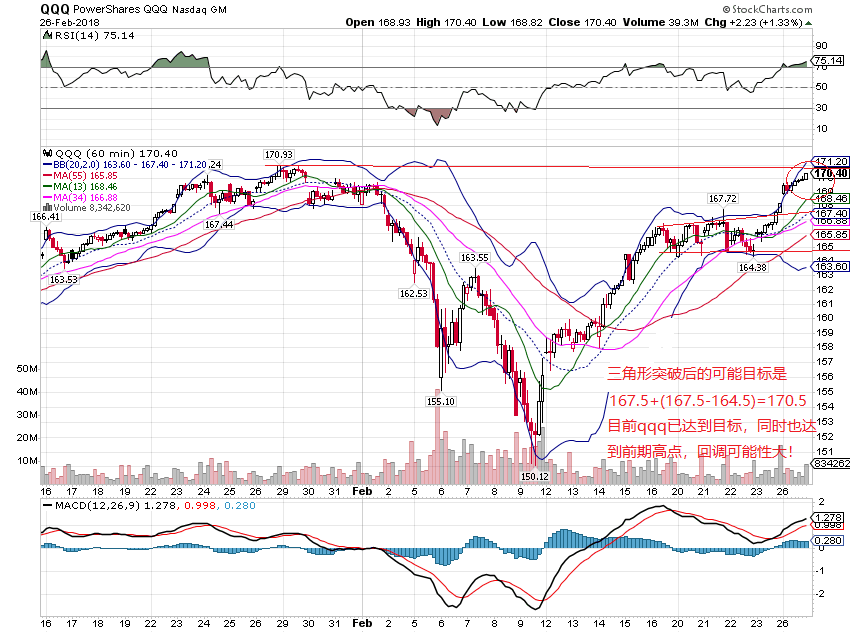 小时图显示,qqq完成三角形整理突破后,已经达到理论上的目标价位,同时qqq也反弹回到前期的高点(见图)。双重阻力之下回踩的可能性极高。周一的缺口有可能成为耗尽缺口!fang+msft占qqq的权重接近50%,这几个牛股在这次大反弹中的领涨角色令人惊奇!密切关注它们在周二盘中的走势表现。如果qqq失去了上发张的动力,那大盘spx也就岌岌可危了。个人看法,不做为投资依据。