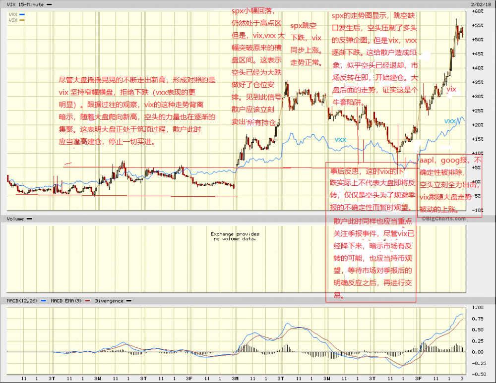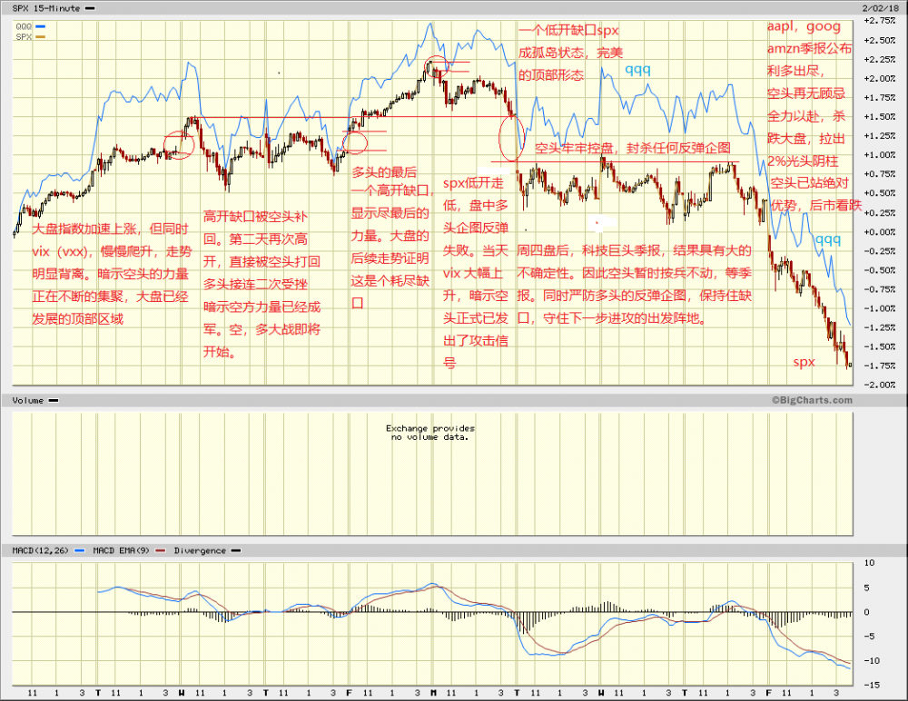 现在会过来思考,明白了为何一月末vix的背离正确地预测了周二的跳空下跌。而上周三,周四vix的走势偏牛背离和周五的大幅下跌矛盾。现在回头看很清楚,空头选择周五出拳,就是等待周四盘后aapl,goog和amzn的季报之后,利多出尽,排除了一切不确定性,才可以无后顾之忧,放手大干。。。。(详细叙述见下图内插语)。