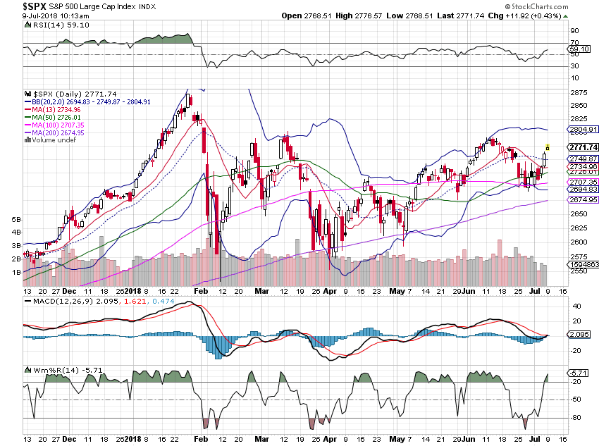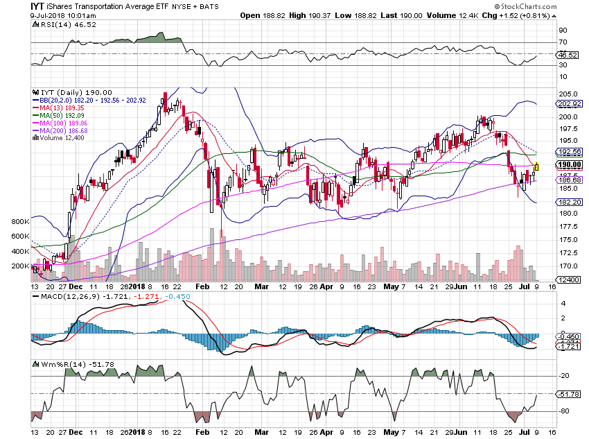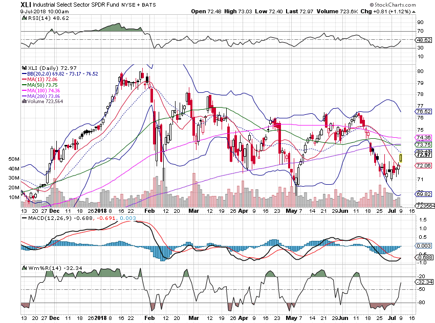 因为贸易战的影响,上周dow成分股的走势明显落后科技股。今天xli,xlf,iyt涨辐1%,走势明显强于科技股(qqq涨0.20%)。有dow(涨0.77%)强反弹支持,大盘spx有可能继续上爬,可能的目标是2790.