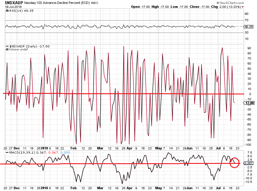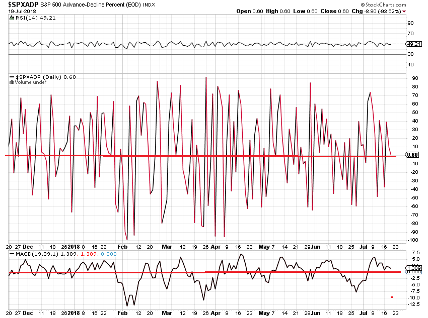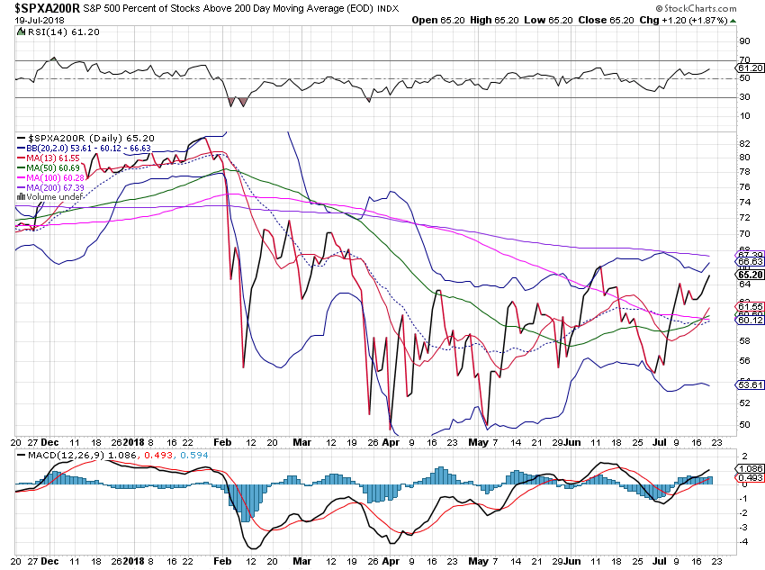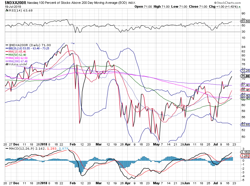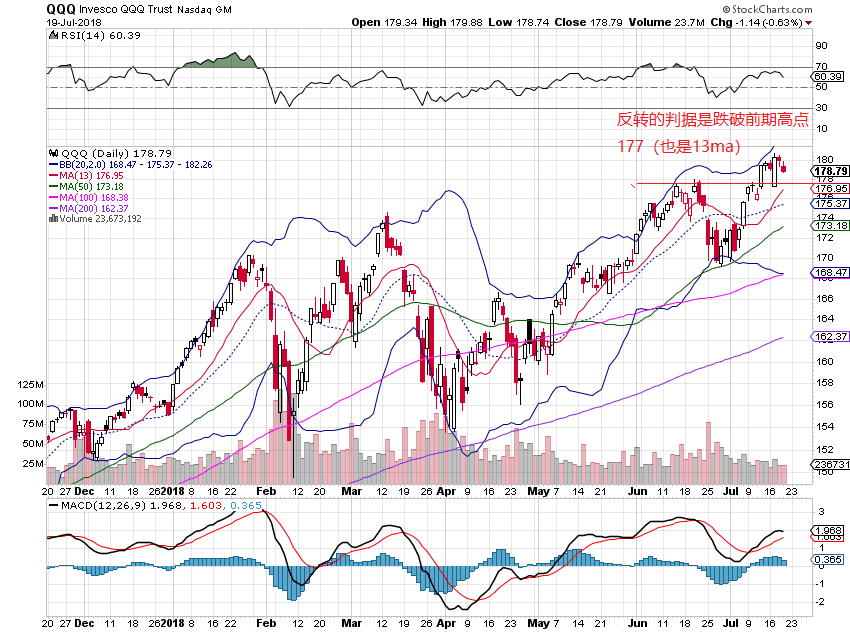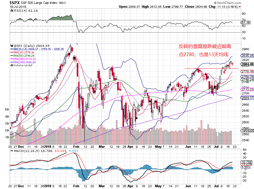 周四,三指数低开,全天围绕开盘区震荡,最后,指数收在盘中低点区,dow跌0.5%,nas跌0.4%,spx跌0.4%。 xli,iyt,smh收平,没有维持周三的强涨势,令人失望。除aapl外,faang和msft均大幅度下跌,全天看不到牛的表现。spxa200r和ndx200r走势继续偏牛背离(见图),表明尽管几个大牛股下跌拖累指数下跌,但前期的深跌股仍然在补涨。breadth指数spxmo和ndxmo进一步靠近零线(见图),表明MM正在大力卖出锁利。从日线图看,spx和ndx均处于13天均线上方。目前处于重要的季报周期,市场对个股的季报数据的反应不可预测,指数的实时走势难以预测。在有效跌破13天均线之前,谈论大盘已经由牛转熊为时过早。在操做上,保持大部分现金,小仓位持股,较为安全。