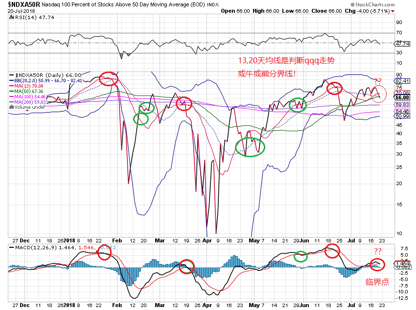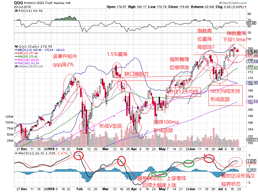 从日线图看,qqq继续在高位振荡,逐步靠近13天均线,那儿也是近期的水平支持点(前期高点阻力被突破后,变成支持点)。看来,下周qqq指数极有可能继续下滑至13天均线。