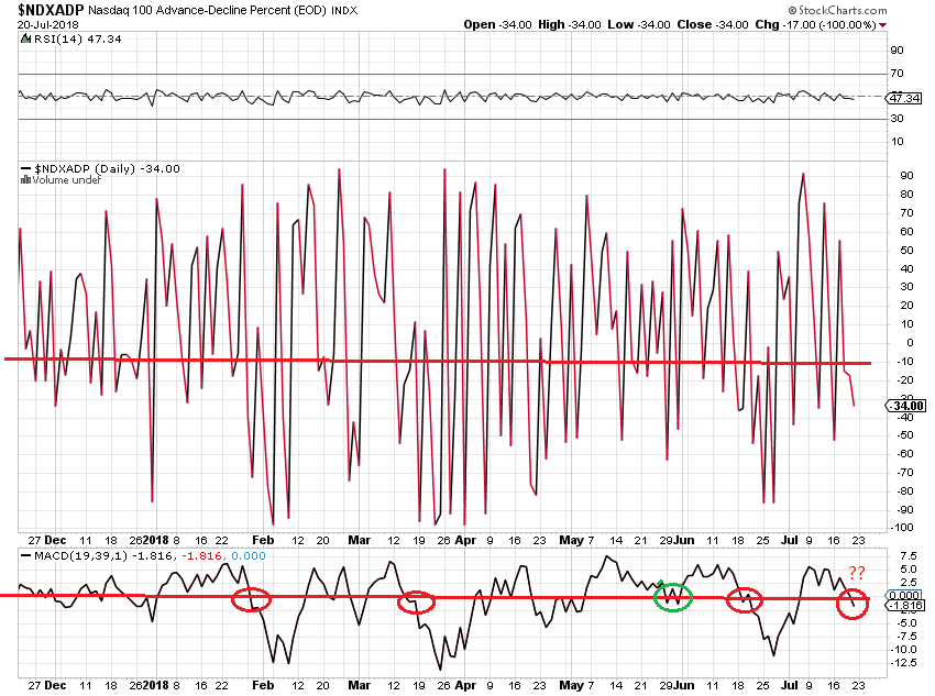 从ndx的几个breadth指标看,qqq目前的走势处于或牛或熊的临界点。ndxmo(定义见前博文)已经跌破零线,开始处于进入熊区,ndxa50r已跌至20天均线,处于牛熊的分界点。ndxa200r前二天逆市上涨,暗示前期深跌的股正在补涨,可是周五该指数大幅下滑,暗示MM已经由拉升变为出货?日线图和breadth指标均显示,qqq目前走势处正在临界点,暂时还不能预测qqq是否下周一是否跳空下跌。