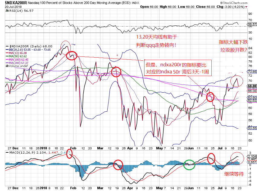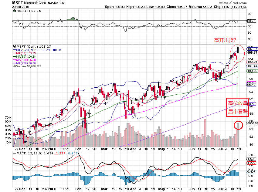 周四msft和swks盘后季报,涨幅超3%。但是周五,它们都是高开后回落,放出天量,提振qqq走势的作用失败。几个重磅的科技指标股,goog,amzn,fb,intc,lrcx在下周先后季报,它们是否要步msft,swks的后尘,拭目以待。