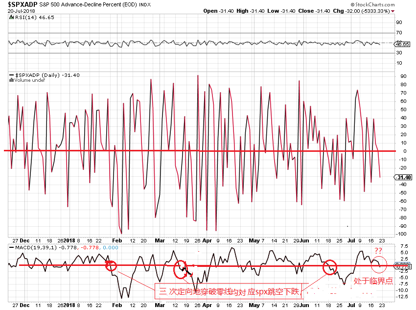 spx的breadth指数spxmo目前处在关键的零线点,spxa50r处于关键的13天均线。它们要继续向下突破,需要spx出现关键的跳空缺口,下周出现这个缺口的可概率小,因次下周这两个breadth指数有可能继续在目前的关键区域内横盘。