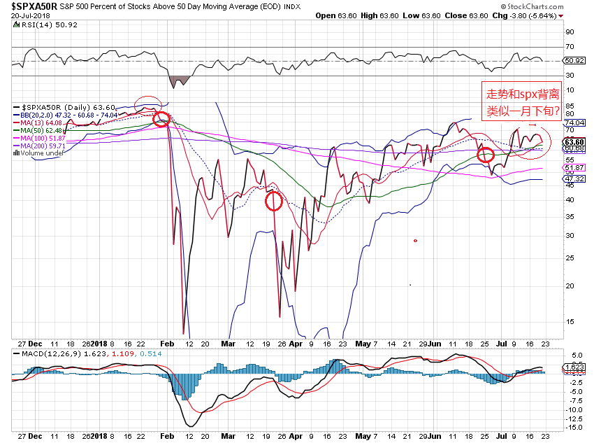从spx上周的日线图看,大盘有回归13天均线区域的倾向。下周,几个重要指标股,amzn,goog,fb,intc发表季报。在季报期间,空头没有胆量开出跳空缺口,另一方面,目前大盘已经在历史高位区域,假如没有突发的利多消息,散户不会追高买进。因此,下周大盘走势的大概率是在13天均线(或者20天均线)上方横盘。