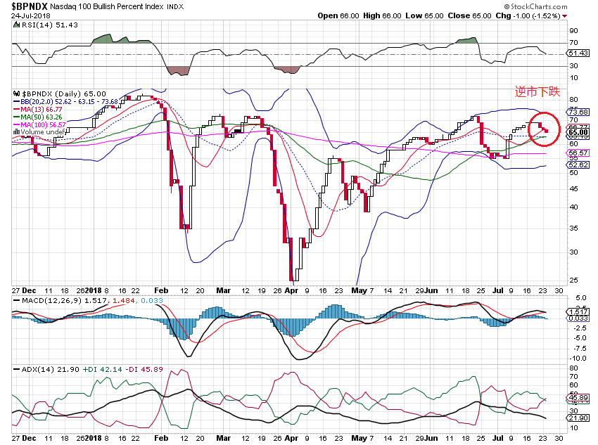 但是,小盘股指数iwm,交通指数iyt和半导体指数smh均已经显露出顶部迹象,breadth 指数bpndx和bpspx今天逆市下跌(见图),走势背离。这暗示spx和qqq也正处于做顶过程中。目前季报期,股市走势的一个明显特征是反复地高开走低。这表明,尽管目前股价不会大幅下跌,但是大幅上涨的可能性也不高,在操作上要避免追高被套。