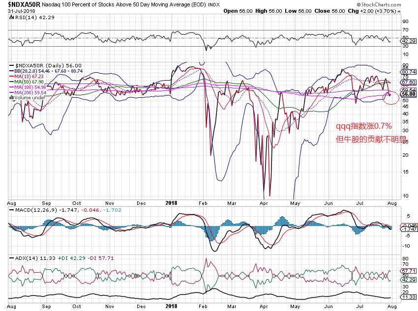 ndx的breadth指标ndxa50r和ndxa200r显示,对周二qqq反弹的贡献主要来之前期深跌股票(见图),即被冷落的价值股。这和前几次qqq调整时的情况不一样。这是新的一波牛市的开始,还是前期大牛市的结尾? 换句话说,没有fang参与的反弹能够走多远?还需要观察。