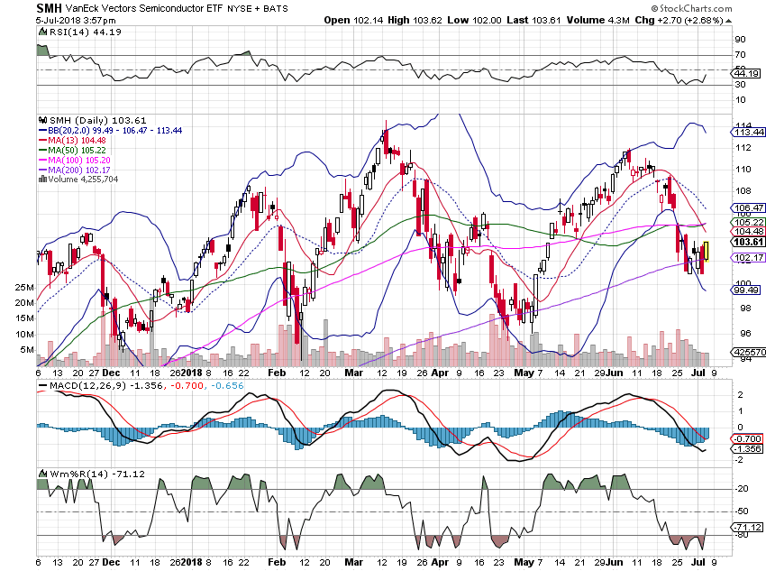 盘前,mu发布消息,中国福州法院的禁售令仅仅减少本季的消售额的1%,并且再次确证本季的消售总值。此消息消除了市场的担忧,mu收盘涨2.6%,smh涨2.7%。周二mu遭到在中国禁售的处罚的消息出来后,mu大跌6%,拖累smh跌1.8%,qqq跌1.2%,市场一片恐慌。今天smh高开1.8%,盘中spx几乎回补今天的跳空缺口时,smh仍然保持在高位,相当坚挺。这令人怀疑,是否MM在有意护盘smh?半导体器件是中美贸易的大头,smh走势对贸易战的事态发展极敏感,MM有意护盘也是在情理之中。