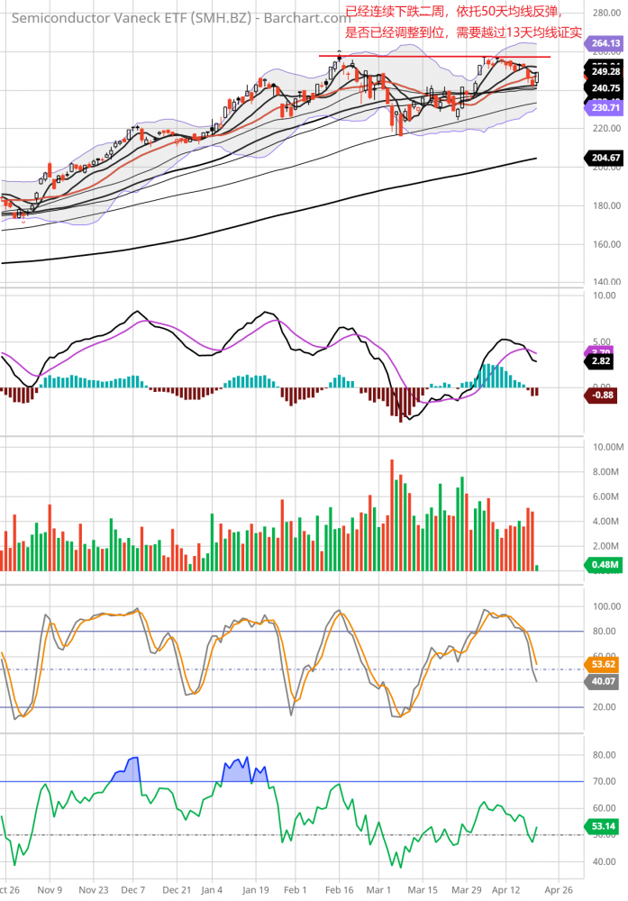 美股这次回调的原因是纯技术上的,spx,nasdaq,和smh分别上涨触及了关键的阻力点(见图),smh领先下跌,跌辐最大,到了50天均线。多头依托50天均线反击,带动了nasdaq和spx止跌转升,最终多头压过了空头。大盘和科技股的后续走势,恐怕还要取决于smh能否上涨越过13天均线。周三盘后,lrcx发表季报,尽管盈利大超预期,但在盘后交易lrcx股价小幅下跌。周四盘后有intc的季报,需要观察市场的反应。