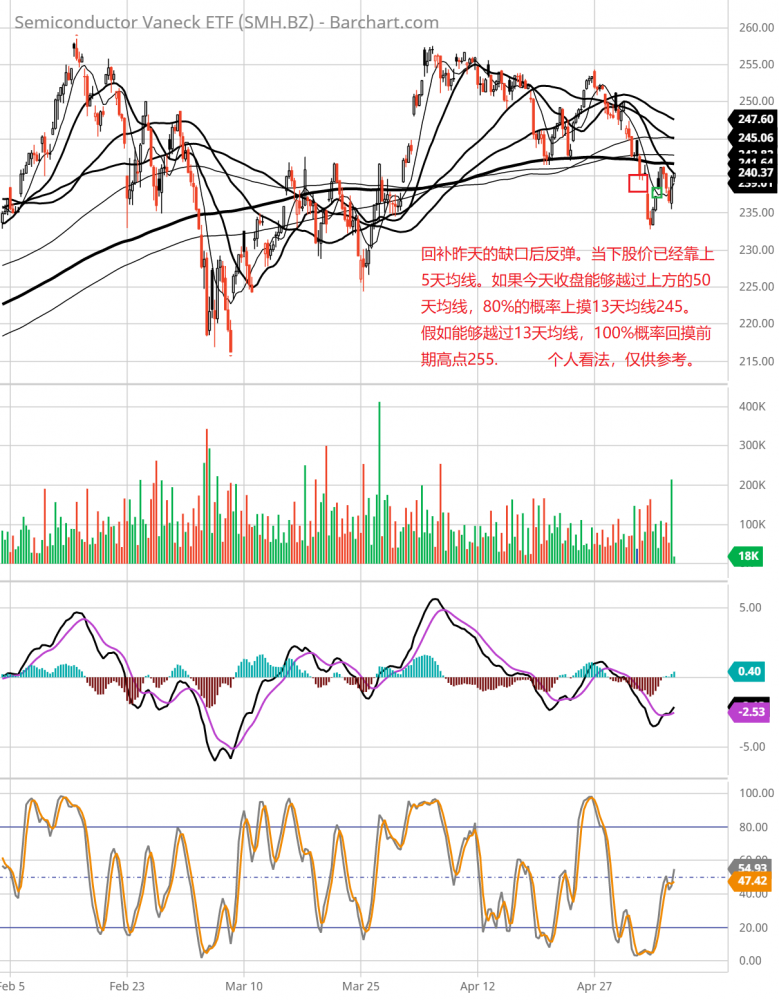科技股本次调整的领跌板块是半导体。smh的走势图(2小时图)显示,2天内,smh走出了一个小双底形态。如果今天收盘能够越过上方的50天均线,则80%的概率,半导体本次调整的最低点就是昨天盘中低点233。如果领跌板块已经触底反弹,qqq也就没有大的下跌空间了。 个人看法,仅供参考,不作为投资依据!