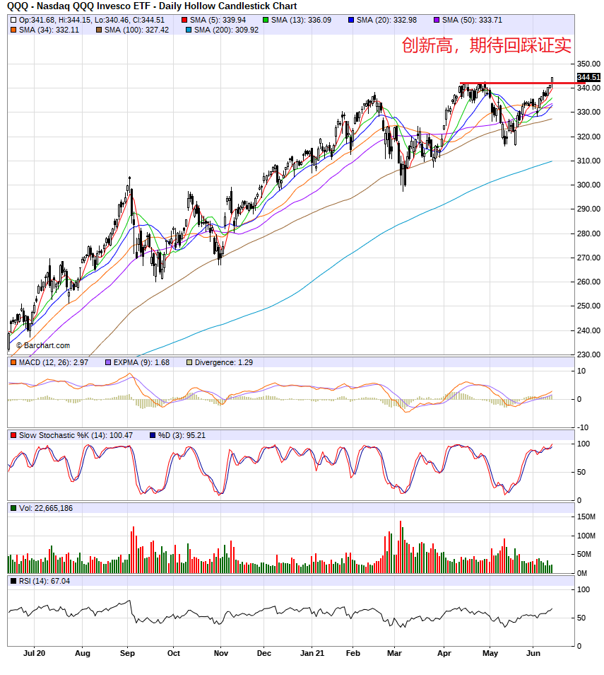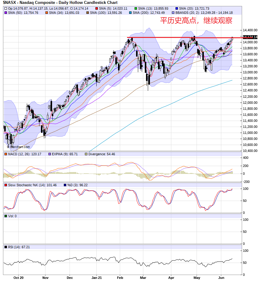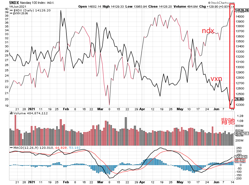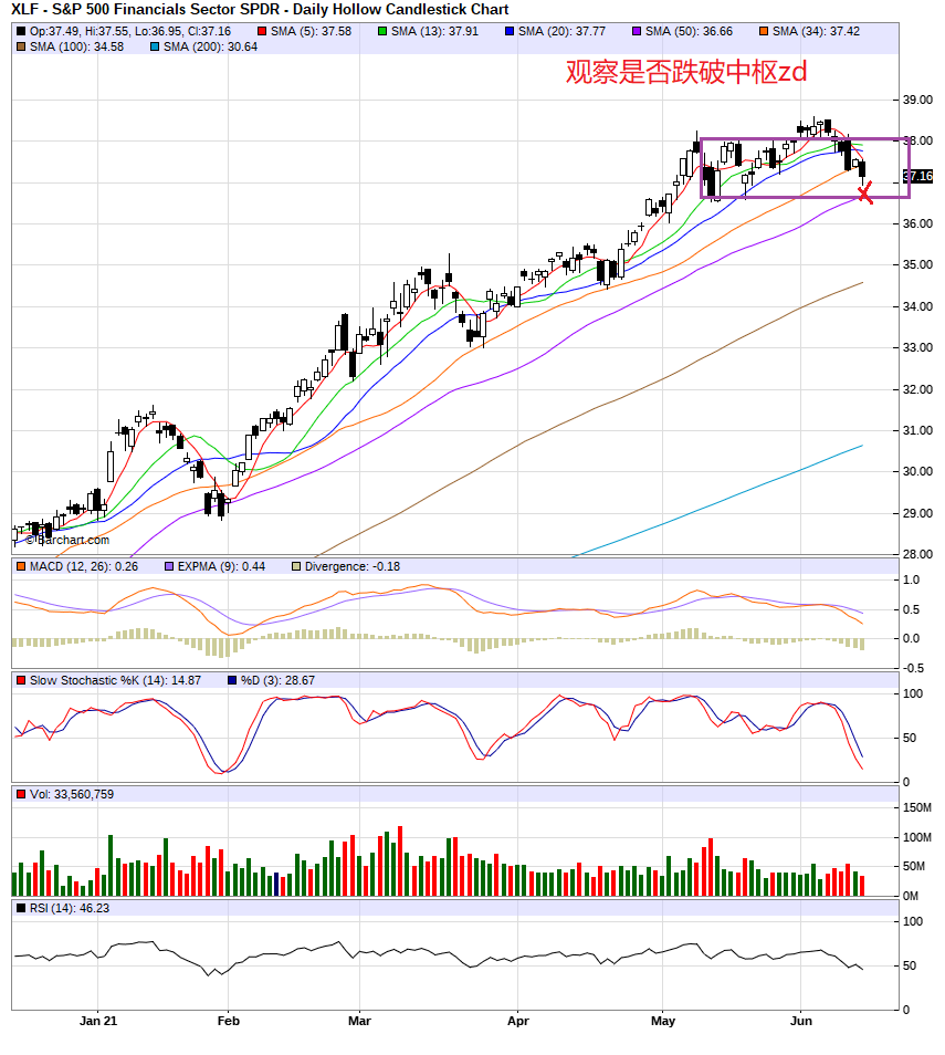 TA观察,nas,qqq进入历史高点区,能否克服阻力,继续上涨?xli,xlf收盘接近盘整区的下边界,能否跌破中枢zd?xlb已经跌破zd,能否重回到中枢内?vix,vxn走势背驰,暗示大盘在做顶?信号混乱,操作上,持币观察。